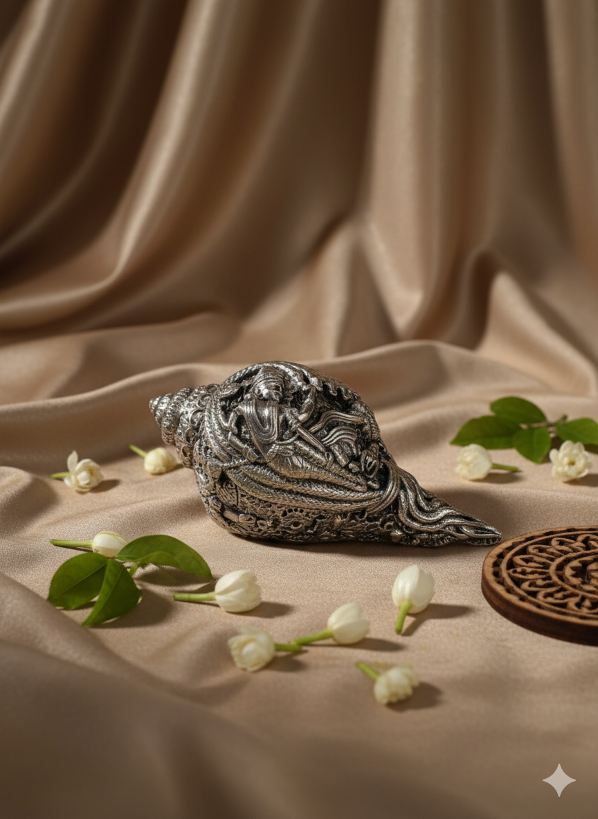 The Divya Hari Shankh is a stunning German silver conch that depicts a celestial scene featuring Lord Vishnu, Goddess Lakshmi, and Lord Brahma. This exquisite piece of art is perfect for adorning your home altar or any sacred space. With its intricate details and shimmering finish, it's a timeless treasure that invites divine blessings and prosperity into your life.
